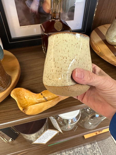 This Appalachian made sipper is wheel thrown and glazed by hand with milky white and brown glaze.  The indent on the side of the sipper gives a comfortable handhold when you are sipping your favorite drink.  Audball Pottery is the made of the sippers.